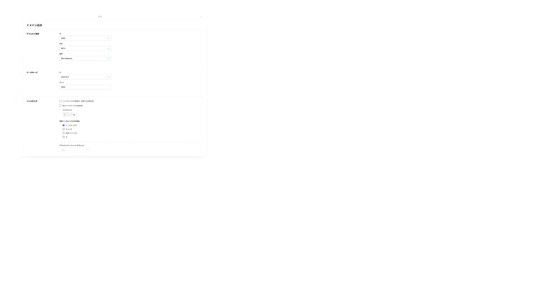 最初の起動時にはローカルホストのポート(5000)に自動的にアクセスします。データサーバのlisten_portが5000以外の場合、データサーバへの接続ができないので、“ドメインの設定情報がありません。”というメッセージが表示されます。