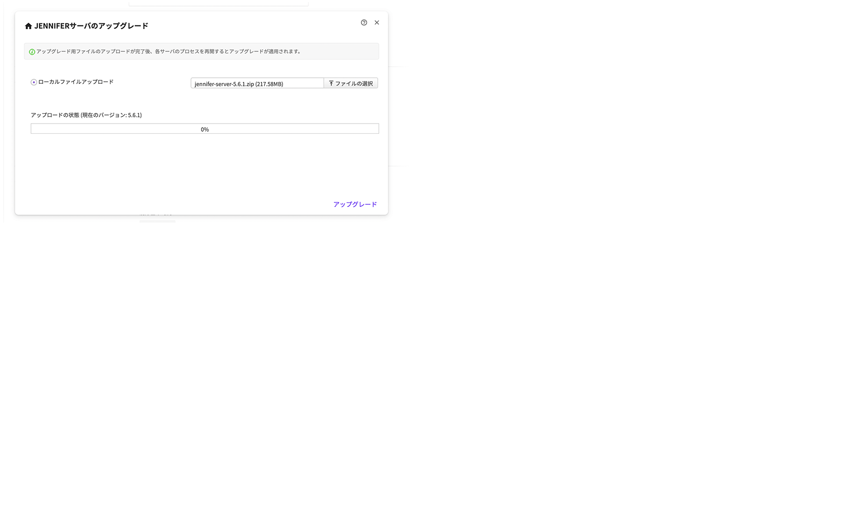 「管理」画面の「JENNIFERサーバアップグレード」メニューで、ダウンロードしたファイルを選択し、アップグレードします。